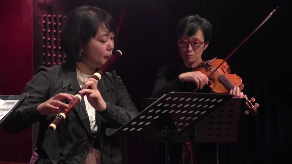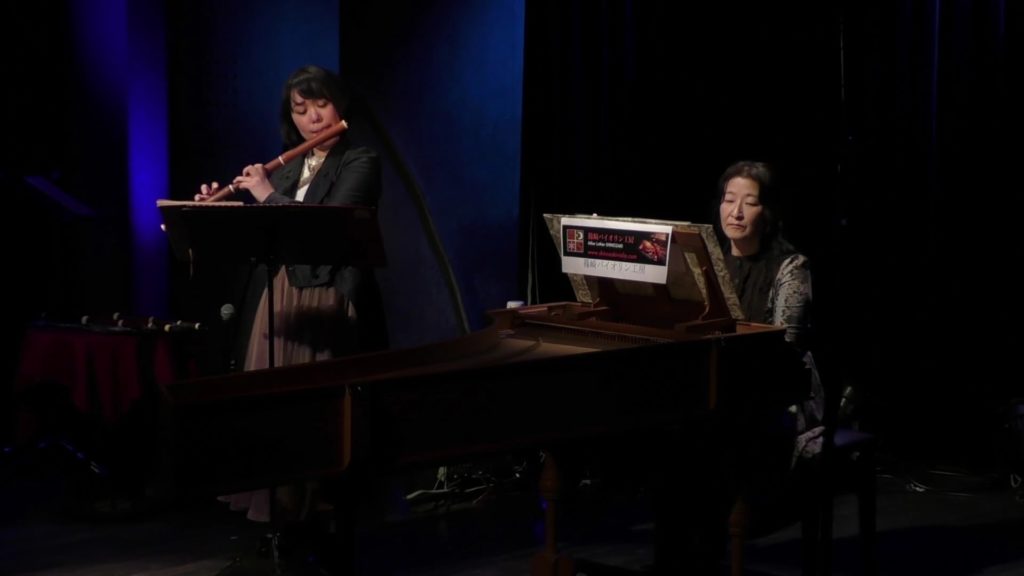 今回は1つキーの付いているフラウト・トラヴェルソ(バロック・フルート他色々な呼び名があります)を吹いています。